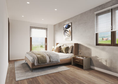 Les grandes fenêtres inonderont l’espace de lumière naturelle et offriront une vue apaisante sur le jardin extérieur et la magnifique vue. Cet appartement disposera de deux chambres à coucher généreusement proportionnées, offrant à chacun de ses occupants un espace privé pour se détendre et se reposer. La chambre parentale de 17 m2 sera particulièrement confortable, la deuxième chambre sera de 11,25. Les deux chambres auront une très belle complètement dégagée au Sud. Vous aurez de plus une grande salle de bain et un wc visiteur.
