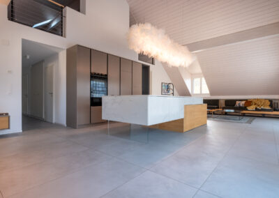 - Cuisine haut de gamme avec un vaste îlot central, électroménagers modernes (dont une cuisinière Tesla, four vapeur, four traditionnel, immense frigo et congélateur séparé) et de très nombreux rangements des deux côtés de l’îlot.