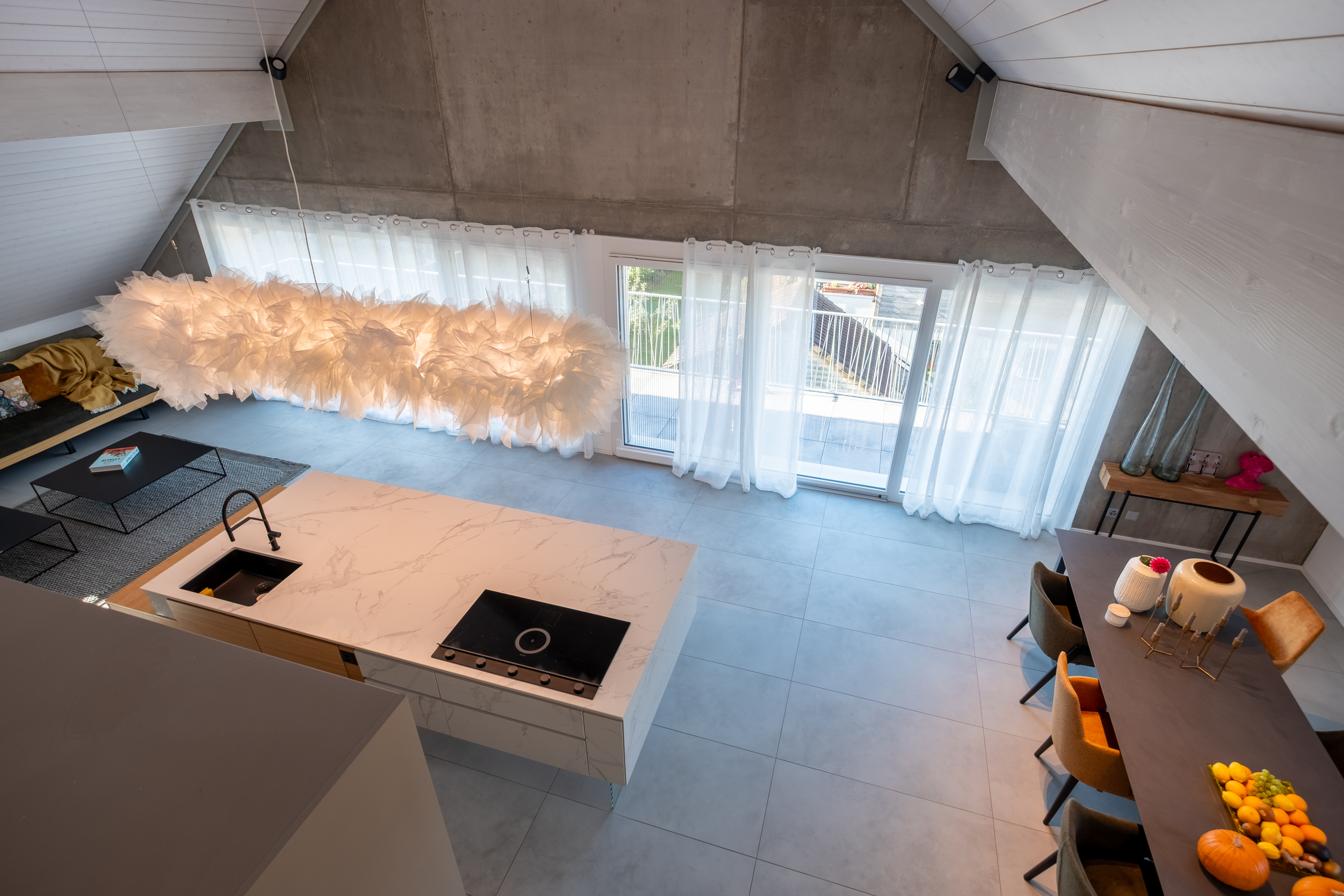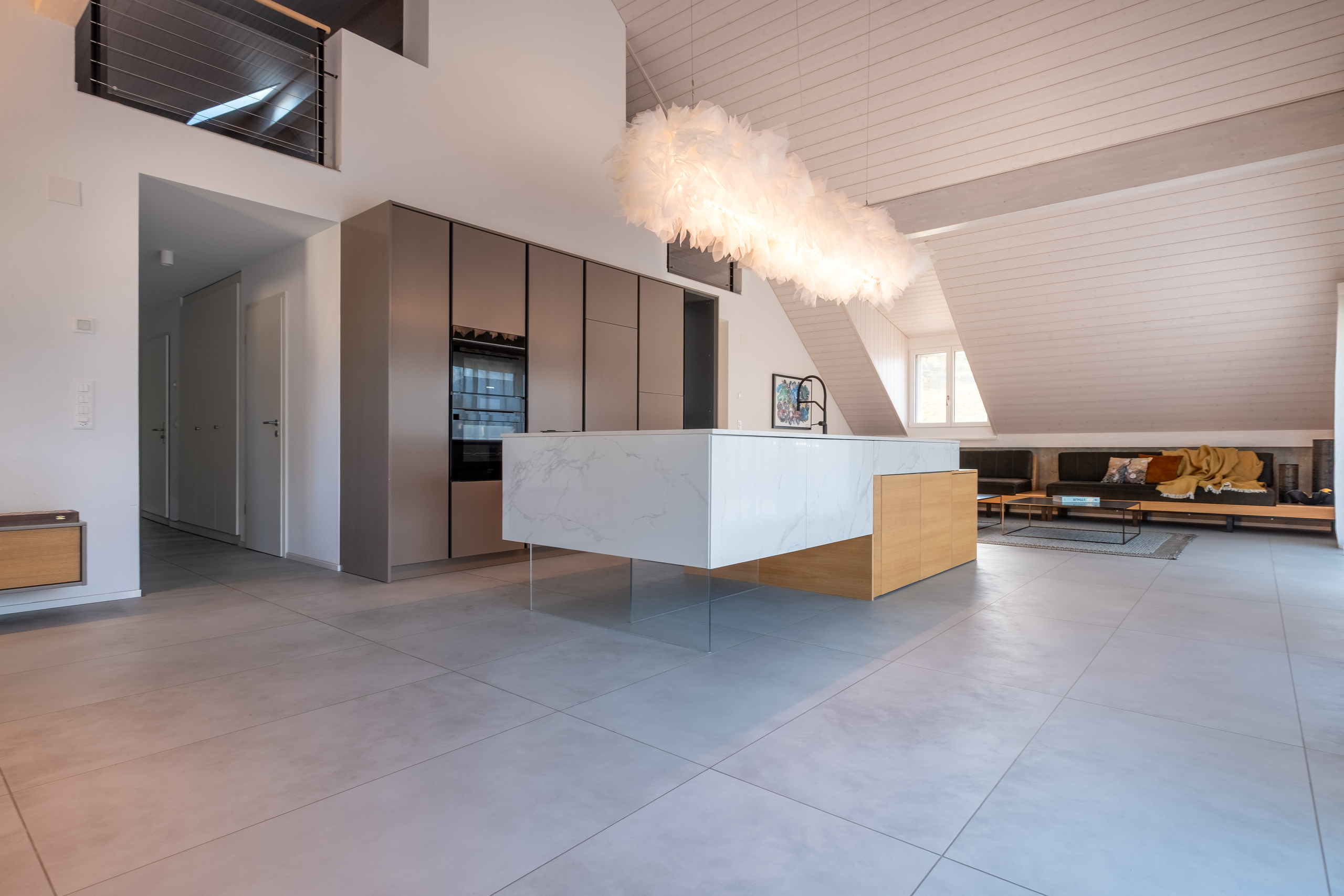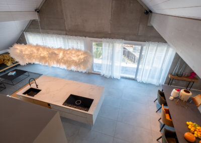 La vaste salle de séjour réunit salon, salle à manger et cuisine ouverte dans un espace baigné de lumière grâce à de grandes baies vitrées.