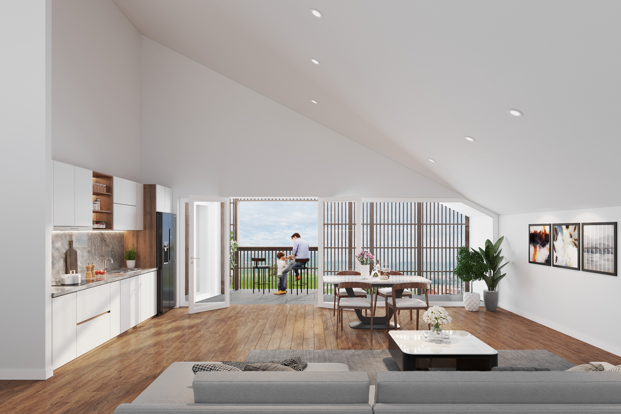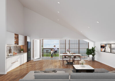 Vous serez accueilli par un magnifique séjour de 41 m2 baigné de lumière naturelle, grâce à de grandes fenêtres et une loggia de 10 m2 qui s’ouvrira généreusement sur une vue panoramique magnifique de la campagne environnante.