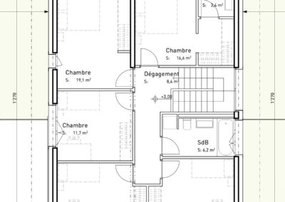 A l’étage supérieur, nous avons prévu 5 chambres à coucher dont la chambre parentale de 16,6 m2, plus sa salle de douche et son dressing, une superbe chambre de 19 m2 qui pourrait être une salle de jeux, un bureau ou chambre à coucher, à votre convenance.