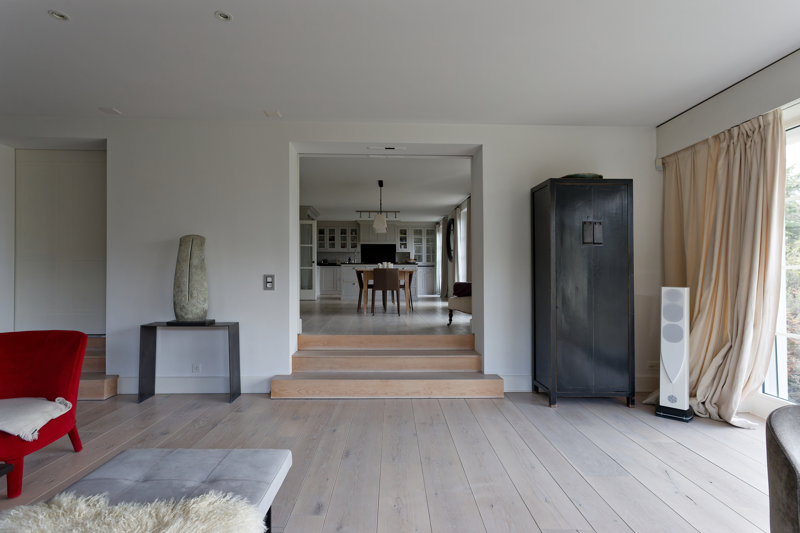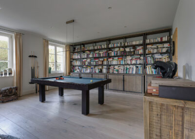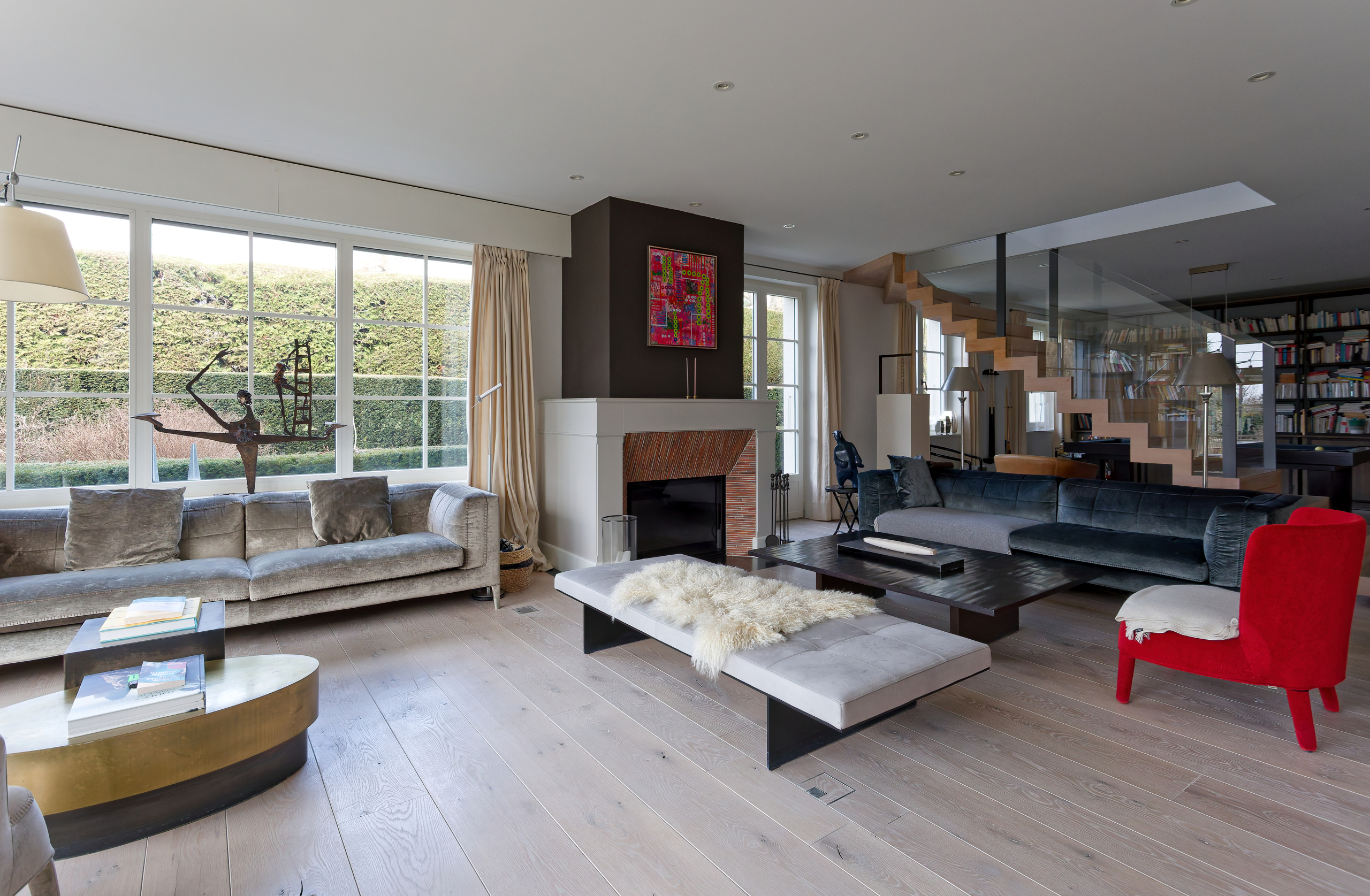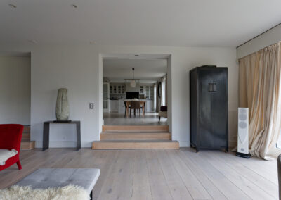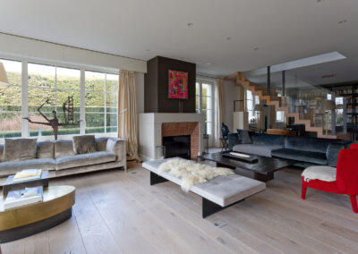 Le cœur de la villa s’articule autour d’un espace de réception somptueux. Le séjour, baigné de lumière grâce à de larges baies vitrées, est sublimé par une cheminée en pierre réfractaire et des volumes impressionnants. Les espaces sont subtilement structurés par un escalier sculptural en bois massif, agrémenté de LED et de parois vitrées, véritable pièce maîtresse de la maison.